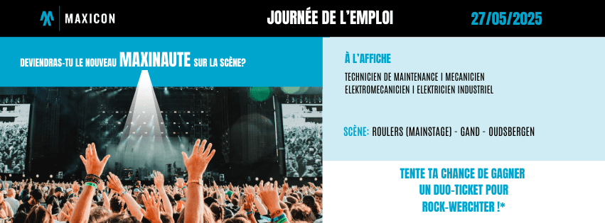 Journée de l’emploi | Vous avez un talent technique ou logistique et de l’expérience ? C’est votre moment ! Le mardi 27 mai, Maxicon organise une journée de l’emploi à Roulers, Gand et Oudsbergen – et nous serions ravis de vous y rencontrer. En bonus, vous avez une chance de gagner un duo-ticket pour Rock Werchter !